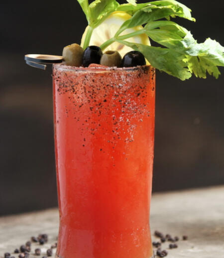 Turali tomato juice served with greens and a garnish of Cinderfoot Olives. ~Inspired by a tale of a pale faced girl in red haunting many an adventurer at the behest of moogles.